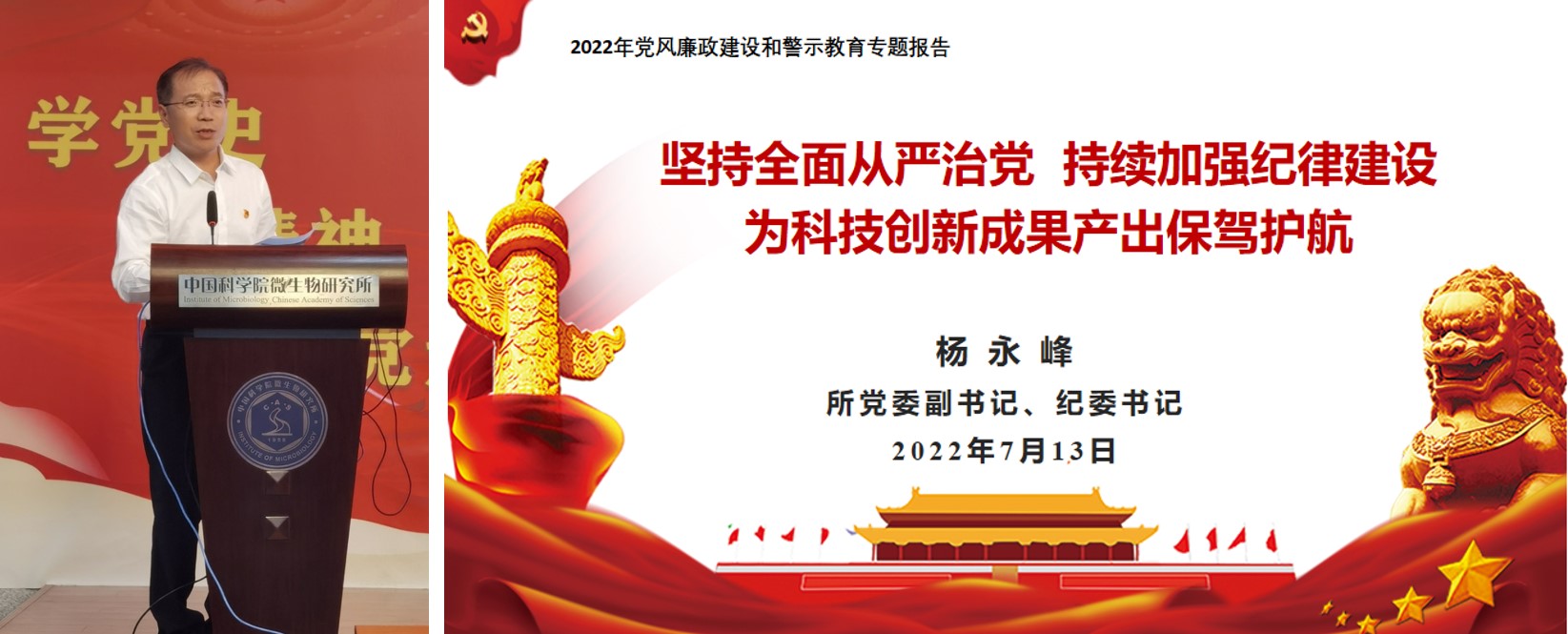 党委副书记、纪委书记杨永峰作题为《坚持全面从严治党 持续加强纪律建设 为科技创新成果产出保驾护航》的党风廉政建设和警示教育专题报告。领学了习近平总书记在中共中央政治局第四十次集体学习讲话精神,讲解了院党组政治巡视的相关要求,并结合丰富案例重申了中央八项规定精神的主要内容,要求科研工作者和行政管理人员从典型案例中汲取教训、引以为戒,规范自身言行,遵纪守法。