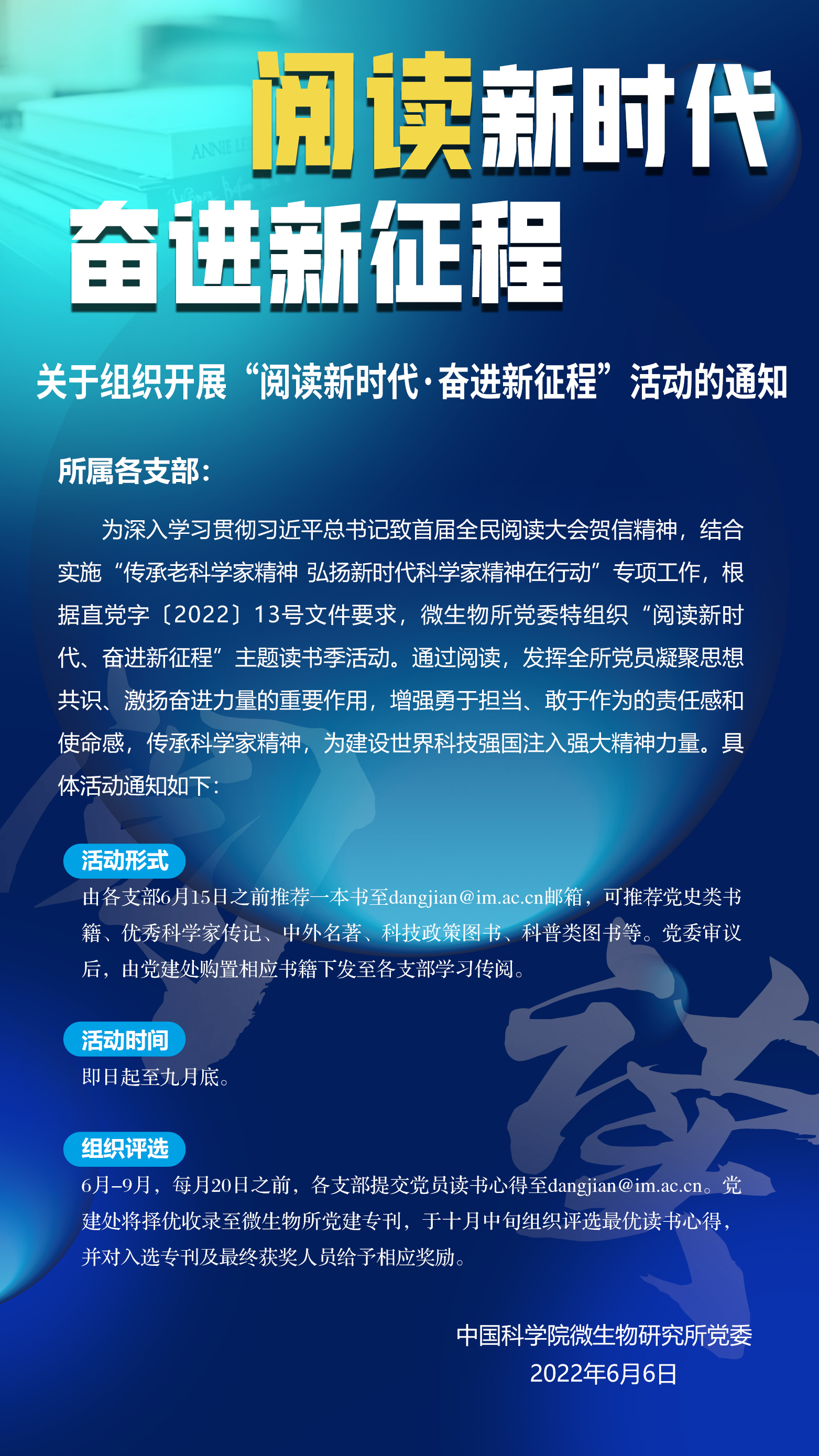 为深入学习贯彻习近平总书记致首届全民阅读大会贺信精神,结合实施“传承老科学家精神 弘扬新时代科学家精神在行动”专项工作,根据直党字〔2022〕13号文件要求,微生物所党委特组织“阅读新时代、奋进新征程”主题读书季活动。通过阅读,发挥全所党员凝聚思想共识、激扬奋进力量的重要作用,增强勇于担当、敢于作为的责任感和使命感,传承科学家精神,为建设世界科技强国注入强大精神力量。具体活动通知如下: