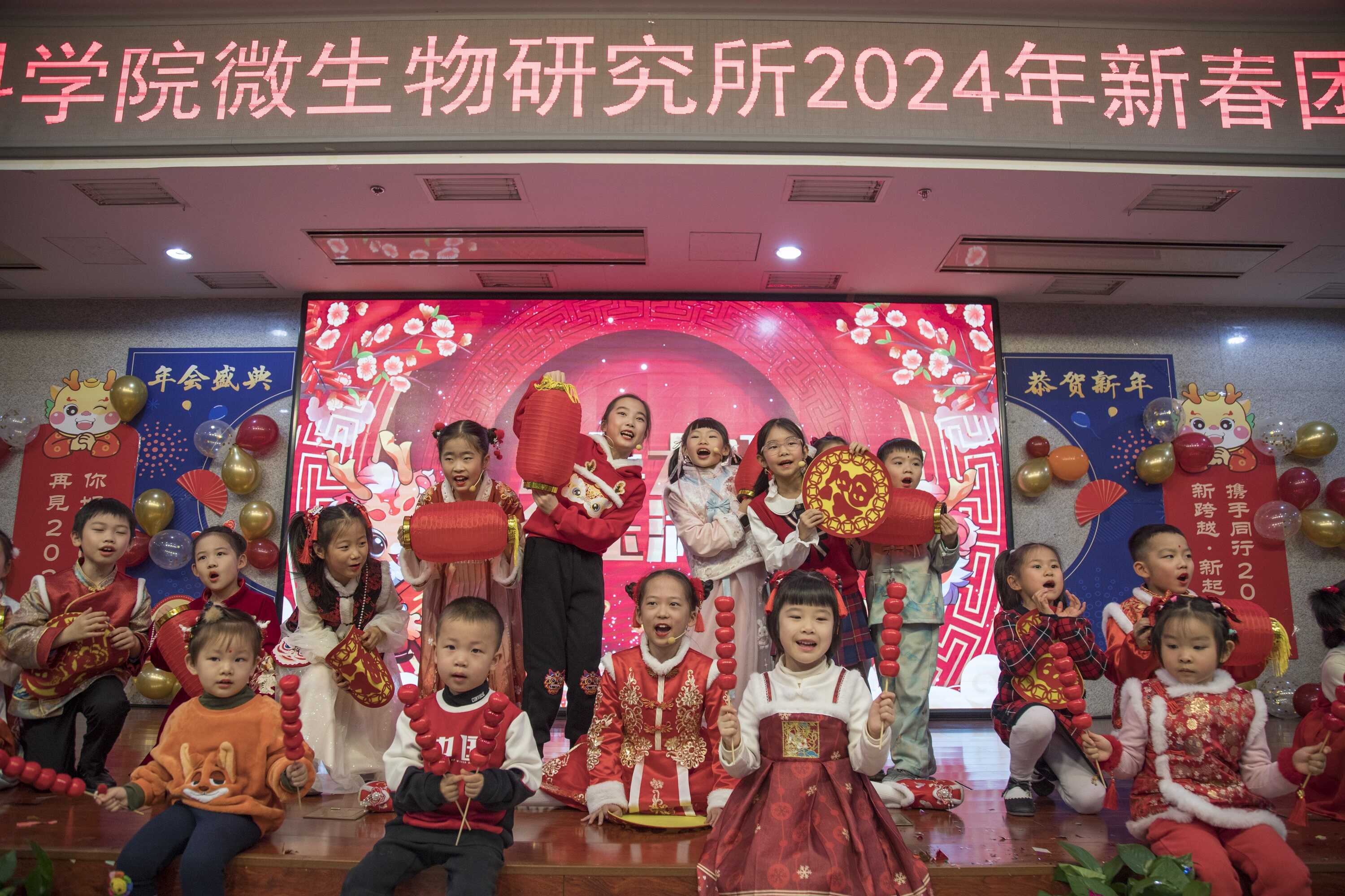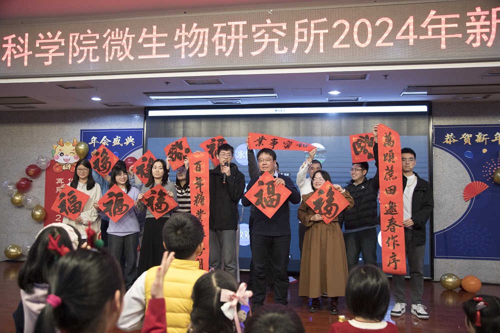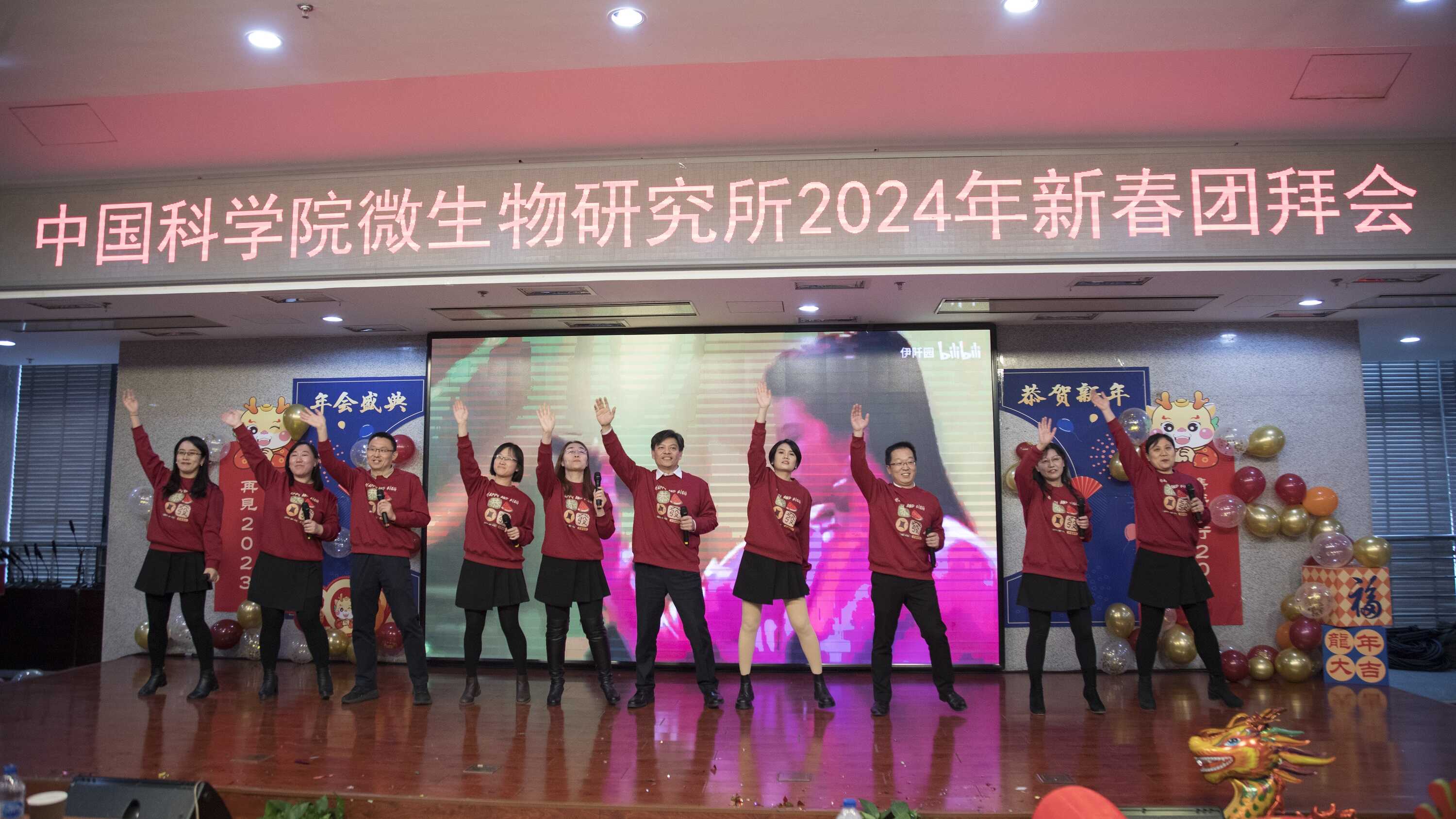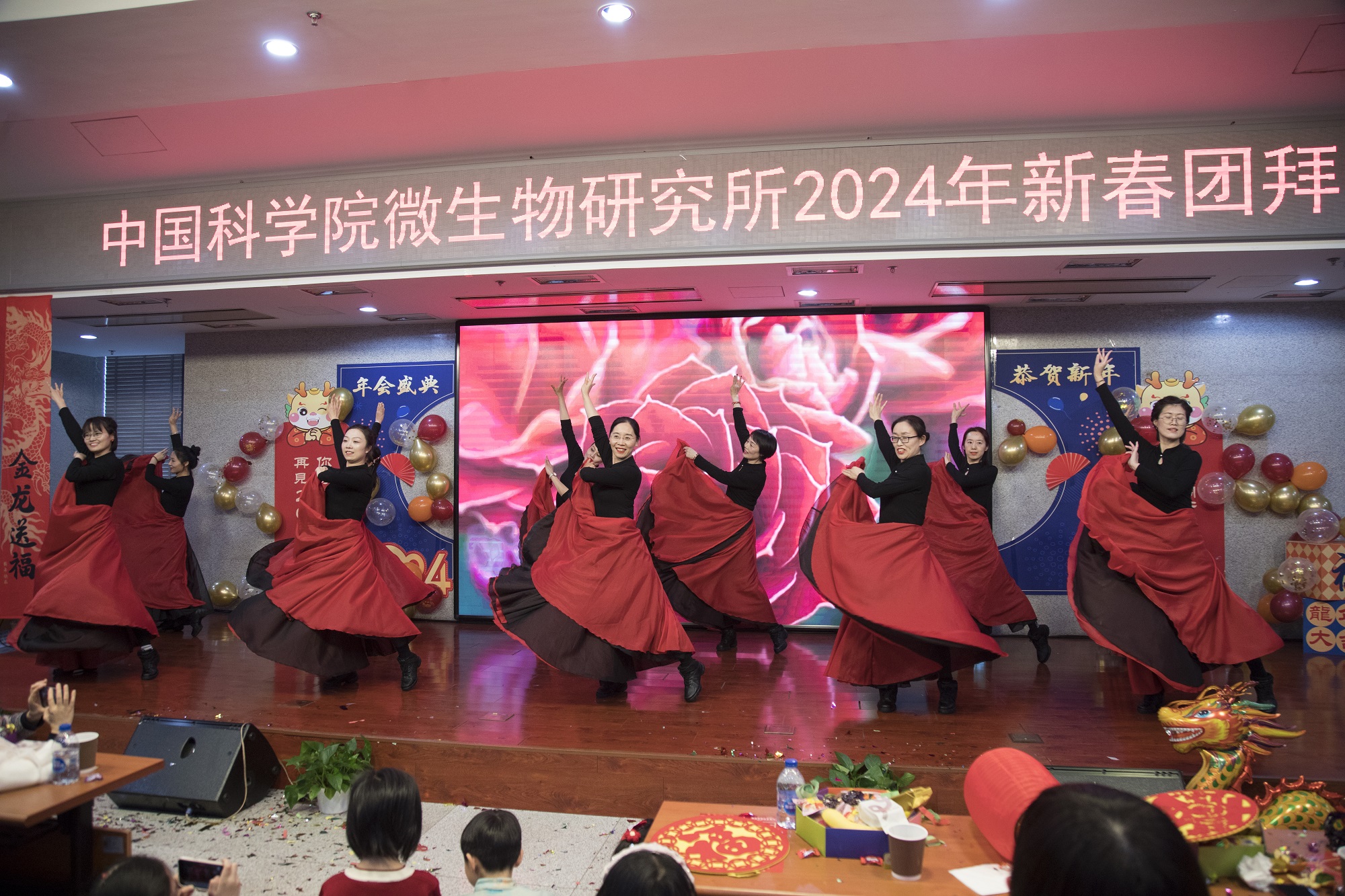 联欢会在《瑞狮闹春》热烈喜庆的氛围中拉开帷幕。开场儿童歌舞《过年了》、钱韦所长带领的舞蹈《蹦蹦哒哒过大年》,直接燃爆了全场的欢乐气氛。暖场节目后,钱韦所长代表研究所领导班子致辞,他指出,今天全所干部职工和研究生欢聚一堂参加迎新春联欢会,我们既要感怀研究所65年历史中为祖国微生物科技事业做出的巨大贡献,更要继往开来、凝心聚力、永立潮头,在龙年到来之际,继续发扬忠诚、团结、勇敢的精神,谱写研究所新时代的伟大篇章。同时,钱韦所长代表研究所领导班子祝全所干部职工和研究生新年快乐、身体健康、阖家欢乐。