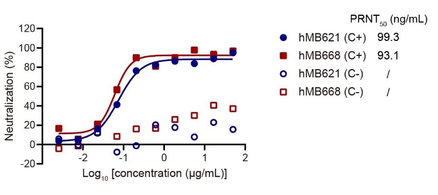 This study first evaluated the pre-existing antibody levels against the MPXV B6 antigen protein in vaccinia vaccine recipients born before the end of the smallpox vaccination program. Then, two monoclonal antibodies, hMB621 and hMB668, were identified and isolated from one of the recipients, targeting different antigenic epitopes on the B6 protein. Binding experiments demonstrated that both monoclonal antibodies exhibited broad binding capabilities to B6 and its homologous proteins in vaccinia virus (VACV), variola virus (VARV), and cowpox virus (CPXV). Neutralization experiments proved that these two antibodies showed potent neutralizing effects against VACV (Figure 1). Animal in vivo antiviral experiments showed that both monoclonal antibodies, administered via intraperitoneal injection, exhibited effective in vivo protection against VACV (Figure 2). Additionally, the study resolved the complex structure of B6 and hMB668, revealing for the first time the structural characteristics of B6 and the binding epitope of the antibody.