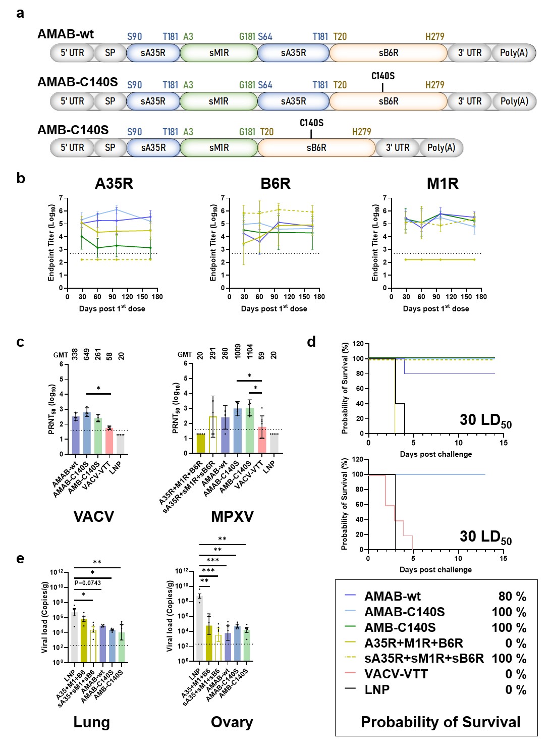 Figure 1: Design of the chimeric trivalent mpox mRNA vaccine (a), antibody titers and durability (b), neutralizing activity (c), protection against VACV challenge (d), and protection against MPXV challenge (e).