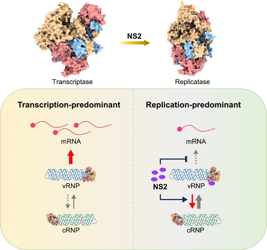 The team led by Deng Tao and Gao Fu from the Institute of Microbiology has collaboratively uncovered the key mechanism by which the NS2 protein of influenza A virus drives the switch from viral RNA transcription to replication.