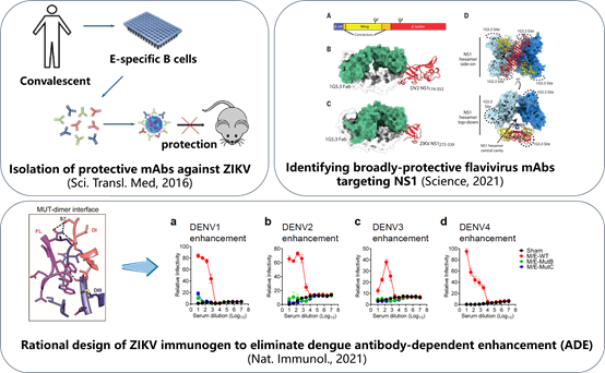 Vaccines and monoclonal antibodies are essential for preventing and controlling flavivirus infections. We are committed to designing and developing novel flavivirus vaccines and monoclonal antibodies for the prevention and treatment of flavivirus infections. Previously, we developed a Zika vaccine based on a chimpanzee adenovirus vector (J. Virol., 2018) and, through rational design, created a novel Zika vaccine that eliminates antibody-dependent enhancement (ADE) of dengue virus infection, revealing the immunological basis for this ADE elimination through immunedominance switch (Figure 3) (Nat. Immunol., 2021). We also isolated protective monoclonal antibodies targeting the E protein from Zika convalescent patients (Sci. Transl. Med., 2016) and discovered a monoclonal antibody, 1G5.3, that provides protection against multiple flaviviruses. We were the first to elucidate the mechanism of broad-spectrum protective antibodies targeting NS1 (Figure 3) (Science, 2021). Additionally, we obtained several protective monoclonal antibodies against yellow fever virus and revealed their structural bases (Cell Rep., 2019; Innovation, 2022), as well as the structural basis of a neutralizing protective antibodie against louping ill virus (LIV) (J. Virol., 2019).