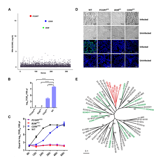 To further investigate the role of FcRn in enterovirus infection, our team analyzed 17 representative strains from various evolutionary branches of EV-B, covering 15 different serotypes. Except for the prototype strains of Echo 6 and Echo 30, all tested strains were recent epidemic strains circulating in China. The results showed that, except for coxsackievirus B4 and B5, the remaining 15 virus strains, including highly pathogenic coxsackievirus A9 and echoviruses 6, 9, 11, and 30, all relied on FcRn for successful infection. This study establishes FcRn as a universal receptor for EV-B, providing critical insights into their pathogenesis and potential therapeutic targets.