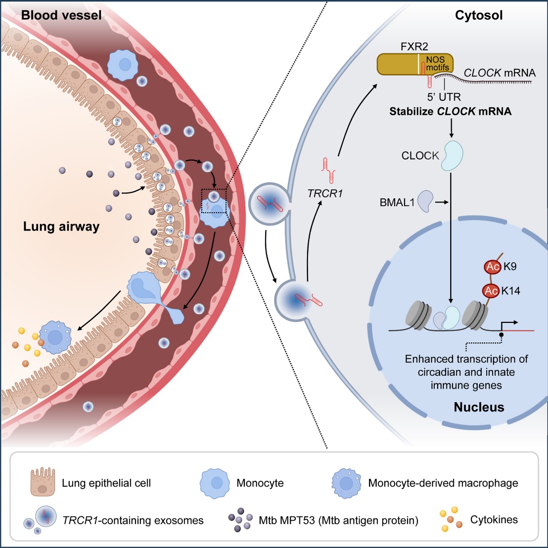 近日,永乐高ylg888888刘翠华团队和北京胸科医院逄宇团队合作,在Cell Host & Microbe发表了题为“A CLOCK-targeting lncRNA induces trained immunity against tuberculosis”的研究论文,揭示了结核病(tuberculosis,TB)抵抗者来源的外泌体lncRNA通过增强节律核心调控分子CLOCK介导的表观遗传修饰,促进宿主形成抗感染训练免疫的新机制。