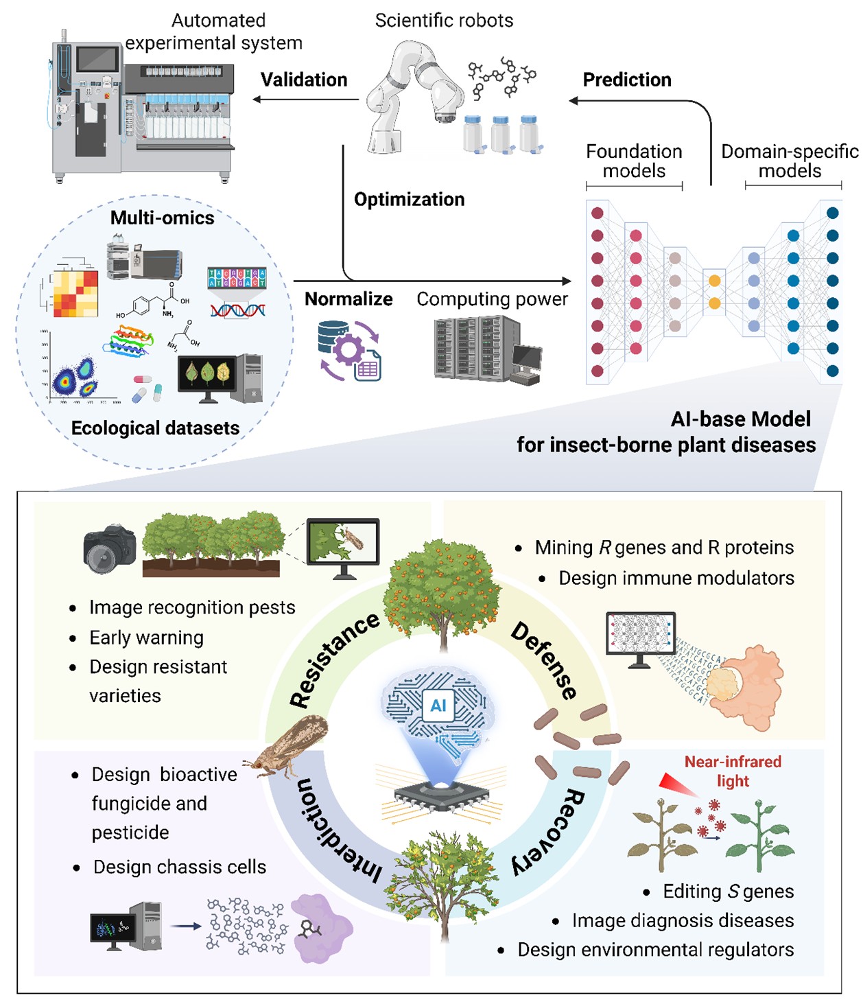 作物虫媒传染病的防控,亟需实现从传统防治向精准干预的范式转变。以木虱传播的柑橘黄龙病和烟粉虱传播的病毒病为例,其病原和虫媒通过调控植物挥发物、抑制宿主免疫、甚至增强虫媒繁殖与扩散能力,形成极难阻断的传播循环。现代生物技术虽已提供多种精准干预工具:如基因编辑、宿主诱导基因沉默以及植物免疫改造等,但其精准设计和应用效率仍需更强决策与设计能力作为支撑。