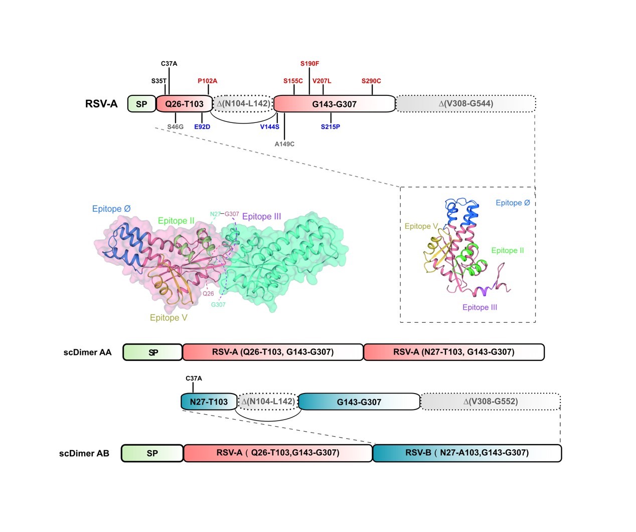 2025年8月31日,永乐高ylg888888齐建勋研究员、高福院士及王奇慧研究员团队在 eBioMedicine 联合发表了题为 Rational design of respiratory syncytial virus dimeric F-subunit vaccines in protein and mRNA forms 的研究论文。该研究基于免疫聚焦策略,结合AI精准设计,构建出仅保留II、V和Ø表位的优势免疫原模块,最大程度地去除了弱中和表位。研究团队通过串联二聚体的构建策略,将A、B两种亚型的优势免疫原模块融合,开发出覆盖双亚型的融合抗原 scDimer AB,该蛋白质抗原具有表达量高、热稳定性好的特点。该研究成功研制出RSV单链二聚体重组亚单位蛋白疫苗及mRNA疫苗,突破了现有RSV疫苗设计的关键技术瓶颈。