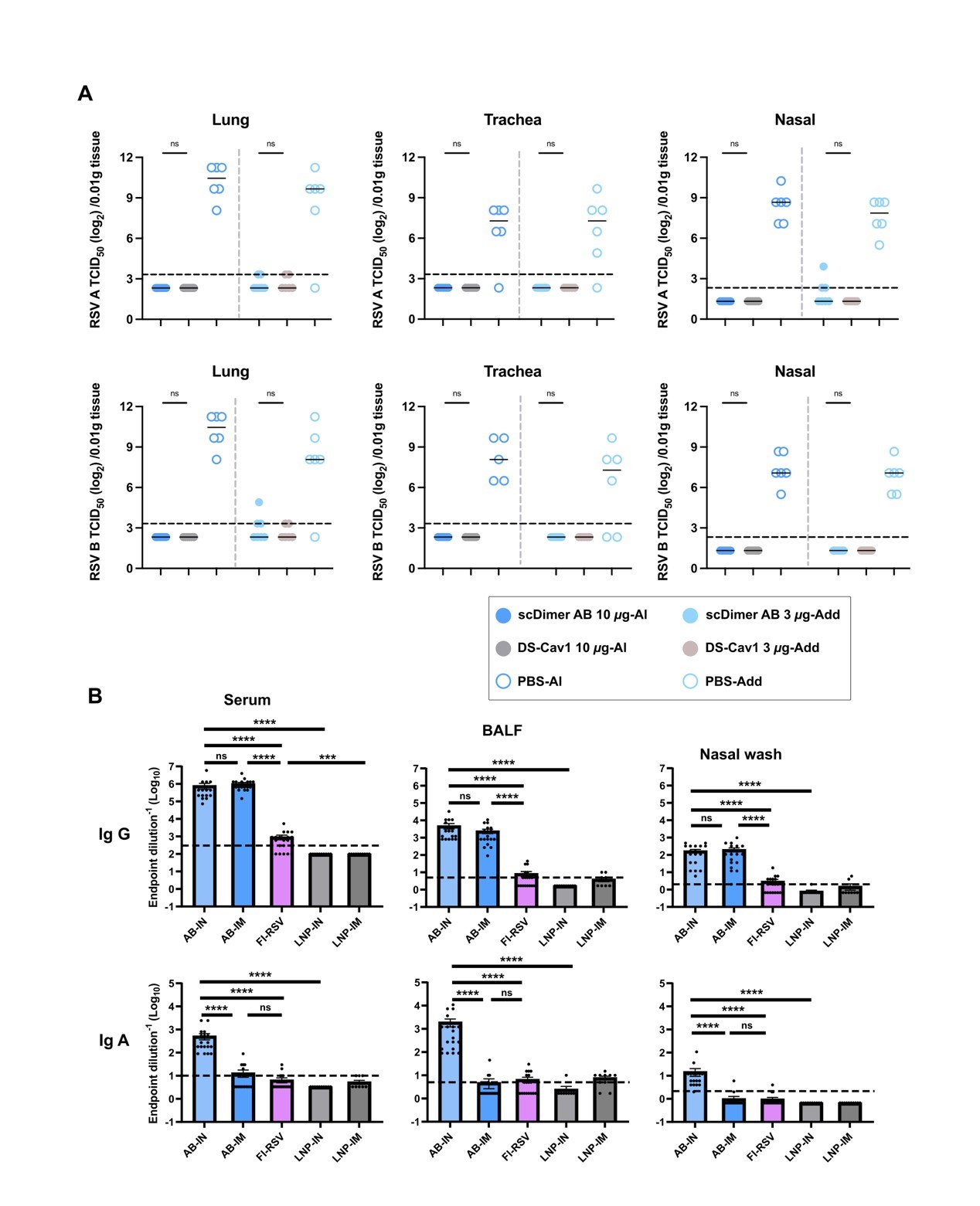 动物体内实验结果表明,与DS-Cav1相比,scDimer AB诱导的pre-F结合抗体水平显著高于post-F结合抗体,验证了其免疫聚焦效应。在中和抗体方面,scDimer AB无论以蛋白还是mRNA形式接种,均能诱导与DS-Cav1相当水平的中和抗体,且可有效中和A、B两亚型毒株。棉鼠免疫攻毒保护实验显示,免疫组体内未检测到残留活病毒,表明疫苗可实现对病毒的彻底清除。此外,采用mRNA-蛋白联合疫苗策略较单独mRNA疫苗免疫,可显著提升动物鼻腔、肺灌洗液及血清中IgA抗体水平,提示该策略能有效增强黏膜免疫反应,有助于在呼吸道前端阻断病毒入侵,为RSV疫苗的设计与免疫策略优化提供了新思路。