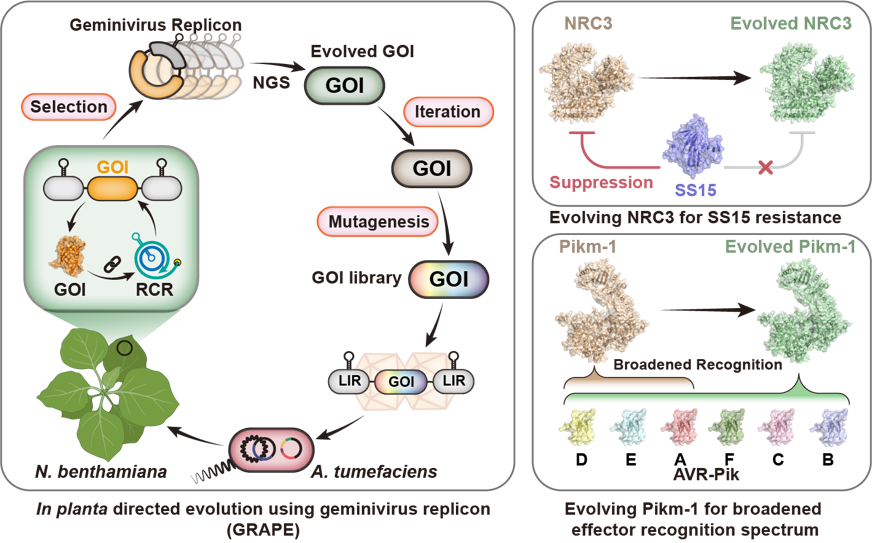 利用GRAPE平台,研究团队对茄科中关键的辅助NLR蛋白NRC3进行了定向进化,借助细胞死亡将NRC3的功能与复制子的滚环复制相偶联,获得了一系列保留免疫活性的同时可以不受线虫效应蛋白SPRYSEC15抑制的NRC3变体。此外,针对水稻整合诱饵型NLR免疫受体Pikm-1,研究团队利用GRAPE进行两轮迭代定向进化,获得了可以同时识别稻瘟菌AVR-Pik效应子6种亚型并激发免疫反应的Pikm-1变体,系统拓展了Pikm-1的效应子识别谱。该策略为抗病作物育种创造了宝贵的遗传资源。众多不同基因亦可借助 GRAPE 系统实现功能进化。研究团队已证实,双生病毒复制子的滚环复制可与多个目的基因的生物学功能形成正向偶联。GRAPE 系统为植物基因及蛋白的工程化改造提供了快速、高效的技术平台,填补了当前植物生物学领域的一项重要空白。